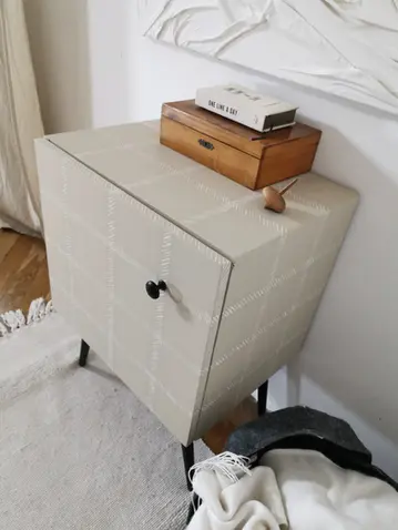 Über ihren gesamten Korpus ( inkl. Tür) ist ein handgemaltes Karomuster mit vielen (zu viele zum zählen) kleinen hellgrauen Strichen angebracht.